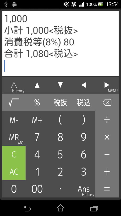 式と履歴が見れる電卓 とても簡単な足し算なのに、電卓に何回も数字を打ち直した経験はありませんか?これは、一般的な電卓では入力した数字が表示されないためです。この電卓アプリは、入力した式がそのまま表示されるので、そのようなことがありません。しかも、計算を終えた式をスクロールして見ることができ、数字を直して再計算も行えます。