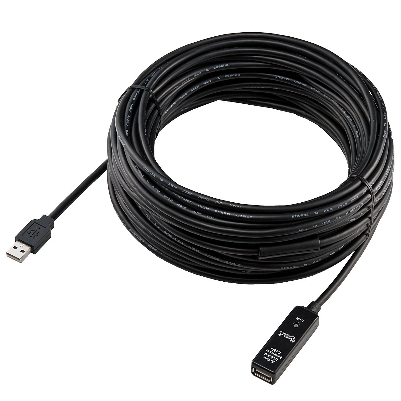 USBは最大5mまでと決まっているようです。リピーターケーブルと言うのを使うと20mまで延長できる、と説明されています。